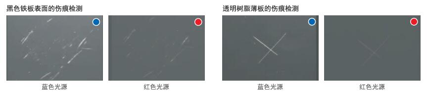 第2組圖是藍(lán)色光源和紅色光源分別對黑色鐵板和透明樹脂薄板的傷痕檢測。