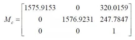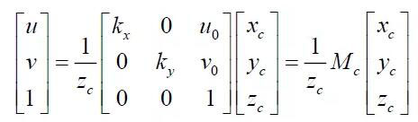 其中:(u,v)是特征點的圖像坐標,(u0,v0) 光軸中心的圖像坐標,(kx ky )是X 軸,Y 軸方向的放大系數(shù),(xc yc zc) 是特征點在攝像機坐標系下坐標, Mc 是攝像機內(nèi)參數(shù)矩陣。