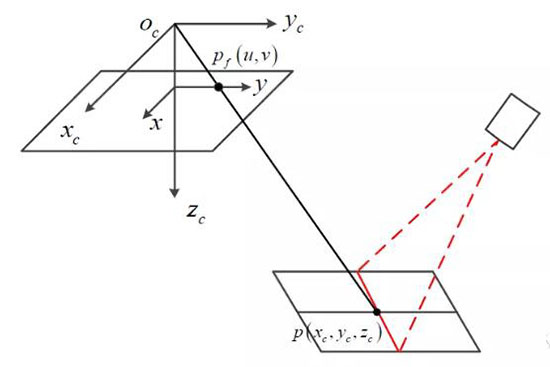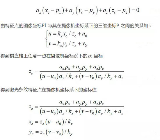 依據(jù)激光條紋特征點圖像坐標就可以得到其在攝像機坐標系下的三維坐標: