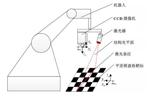 一個六自由度機器人,一個CCD 工業(yè)攝像機,一個激光器和一個平面棋盤格靶標。