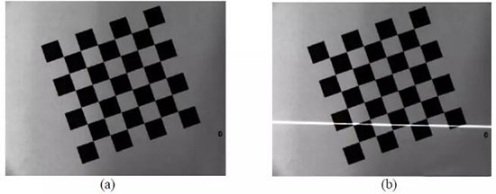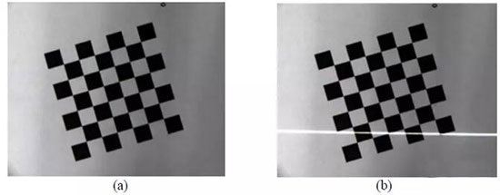 圖像的獲取是在攝機參數(shù)標定過程中同時完成。 首先將棋盤格放在工作臺上, 在這個初始位置,利用攝像機采集一幅圖,如圖 (a) 所示 。保持攝像機和棋盤格的位置姿態(tài)不變,打開激光器讓條紋投射到棋盤格上, 再采集一幅圖像如圖 (b) 所示: