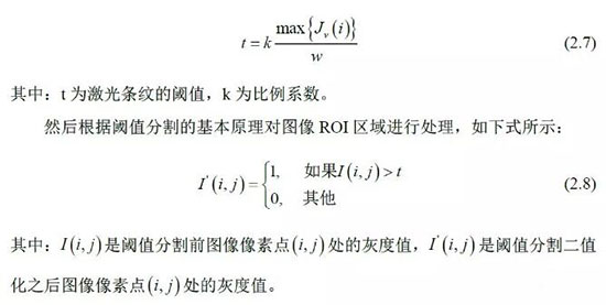 根據(jù)圖像中激光條紋的灰度值高于圖像中其它像素的灰度值以及激光條紋所在區(qū)域比較集中的特點,利用圖像ROI 內(nèi)行像素灰度值之和計算激光條紋的自適應閾值: