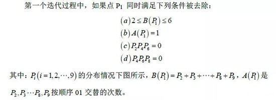 該方法通過迭代提取圖像骨架,每個迭代過程分為兩步,第一步去除東南邊緣和西北角的點,第二步去除西北邊緣和東南角的點。