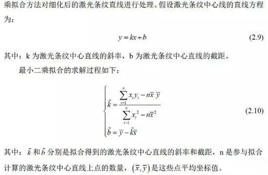 選取激光條紋中心線上的兩個點作為激光條紋的特征點,為了提高激光條紋中心線的提取精度,利用最小二乘法擬合方法對細化后的激光條紋直線進行處理。
