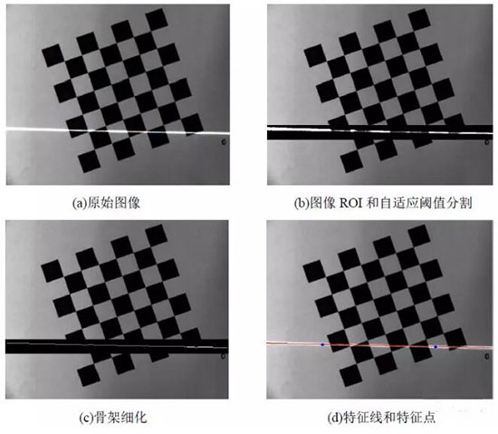 圖像處理的目的是提取激光條紋上特征點的圖像坐標。分為圖像感興趣區(qū)域(ROI)確定、自適應閾值分割、骨架細化和特征點計算。