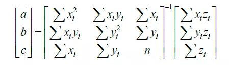 至此,得到四個激光條紋特征點的圖像坐標,由上式得四個激光條紋特征點在攝像機坐標系下的坐標,由于三點確定一個平面方程,使用最小二乘法計算結構光平面方程如下: