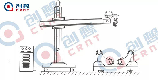 如下圖中所示,這是一個(gè)筒形結(jié)構(gòu)件自動(dòng)焊接系統(tǒng),該系統(tǒng)主要由懸臂式焊接操作機(jī)、自調(diào)試滾輪架、自動(dòng)弧焊機(jī)等組成。