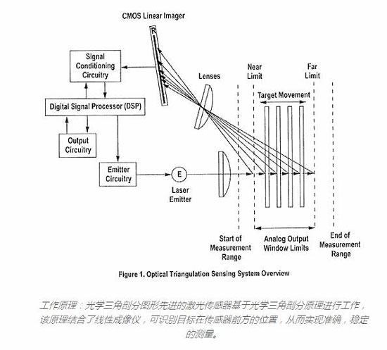 目標(biāo)與傳感器的距離決定了光線穿過接收器透鏡的角度;然后,該角度確定接收到的光將照射到線性成像器的位置。如果目標(biāo)距離較遠(在最大指定范圍內(nèi)),則光將朝成像器最靠近激光發(fā)射器的一端落下。或者,如果目標(biāo)位于其最接近的位置(在最小指定范圍內(nèi)),則光將降落在成像儀的相對端,距激光發(fā)射器最遠。線性成像儀上的光線位置在出廠時已針對所有有效目標(biāo)距離進行了校準(zhǔn)。接收到的光通過模擬和數(shù)字電子設(shè)備進行處理,并由數(shù)字信號處理器(DSP)進行分析。