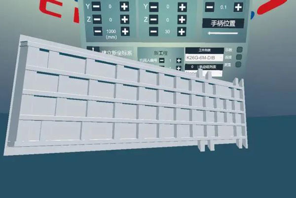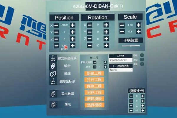 界面空間好似進(jìn)入一個(gè)模擬仿真的房間,操作面板位于中間位置,可以調(diào)節(jié)工件在空間中的位置、調(diào)整工件或坐標(biāo)系的角度旋轉(zhuǎn)、調(diào)節(jié)放大比例(對(duì)于工件大小方便觀察可以進(jìn)行放大縮?。?